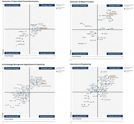 对于阿里云来说,Gartner系列报告的四个方面与阿里云作为“完整的人工智能服务提供商”的定位一致。这四个方面均被纳入新兴领先者领域,表明阿里云在“云+AI”产品设计上处于完全领先地位,并积极应对快速变化的市场。